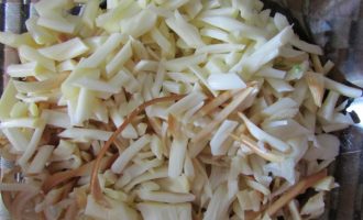 - Разрезаем капусту пополам и шинкуем тонкой соломкой. Некоторые хозяйки немного «мнут» капусту, чтобы она пустила сок и стала более мягкой. Так можно сделать с осенней и зимней капустой. Молодую капусту мять не нужно, так как ее листья и так очень нежные и мягкие.