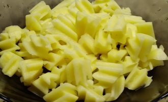 - Картофель нарезаем квадратиками и промываем в воде для удаления крахмала.